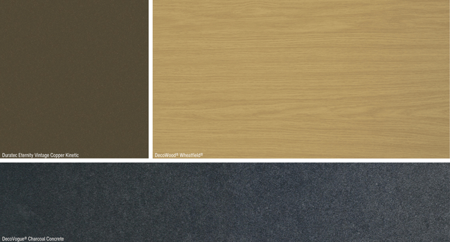 The muted tones of our DECO x Dulux Elemental palette reflects the warmth of a cosy cottage. The DecoVogue® Charcoal Concrete and Duratec® Eternity Vintage Copper Kinetic help ground this palette while the DecoWood® Wheatfield® is used to carry the natural light through the space.