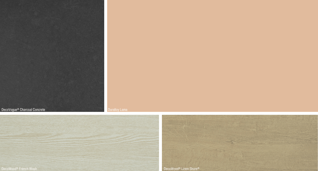 This Evoke palette feels like new beginnings in an older home. The Duralloy® Lama and DecoWood® French Wash pays homage to the retro era, while the DecoVogue® Charcoal Concrete and the DecoWood® Linen Shore® both bring in a timeless element that will withstand for future designs and eras.
