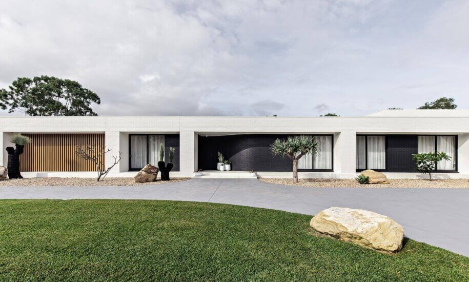 My husband has always loved the Kauffman House in Palm Springs so that was the starting point for the design. There were key modernist design elements that he wanted to include on the façade. The flat roof, timber, horizontal lines and large panes of glass. We made sure we used key materials in the home that were used on the façade to create consistency. The interior features polished concrete, white, black, stone and timber. For the design on the inside, I wanted to create a very relaxed retreat feel and drew a lot of inspiration from Balinese Villas and Byron Bay holiday homes. For me, it wasn’t about staying true to one design style but creating a home that had a particular feeling when people walk through the front door.