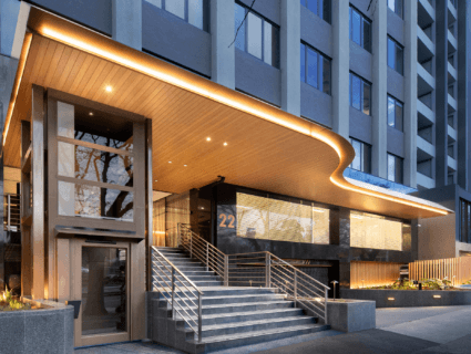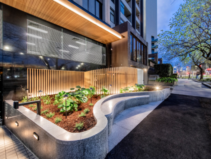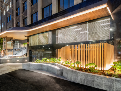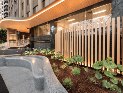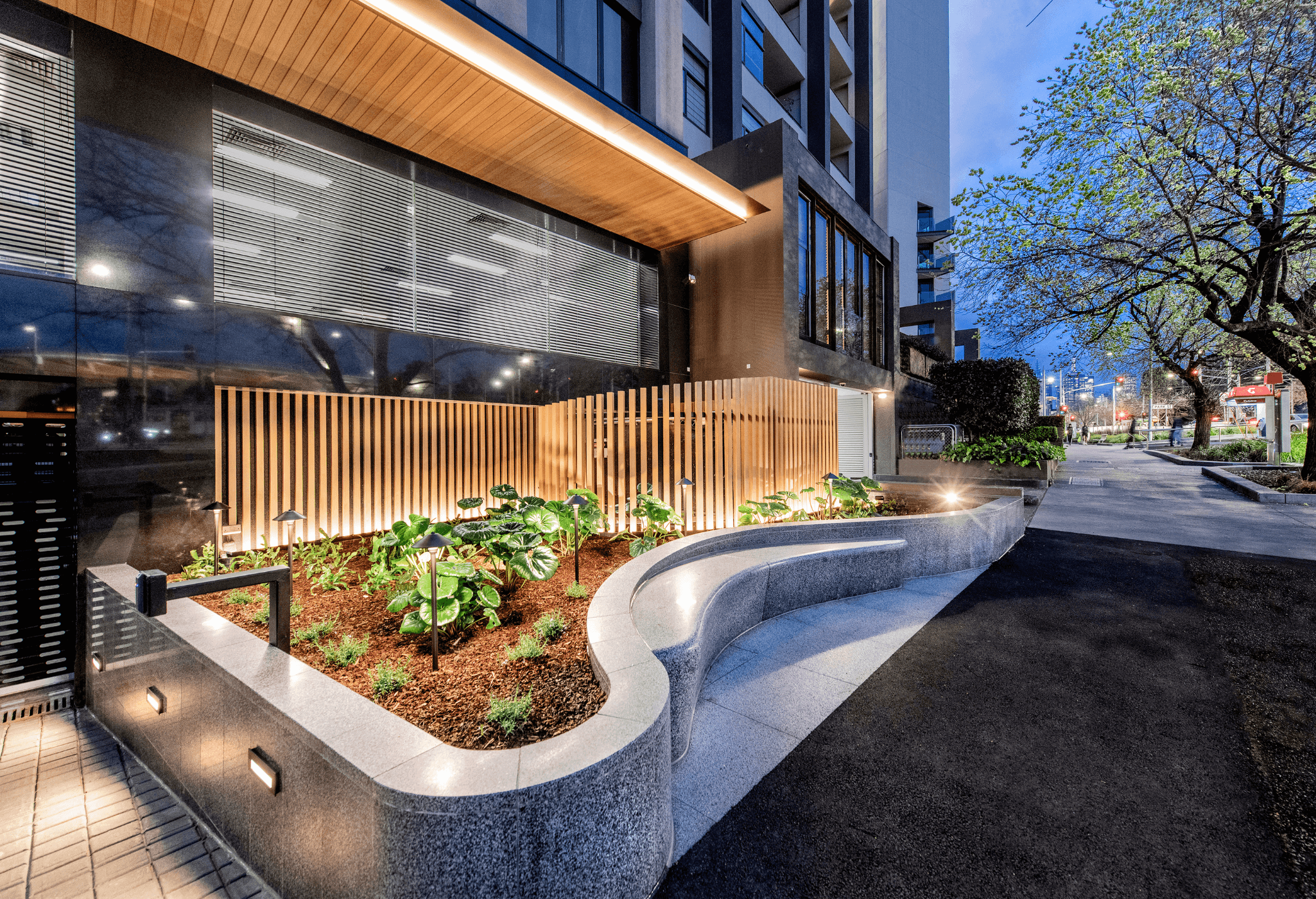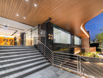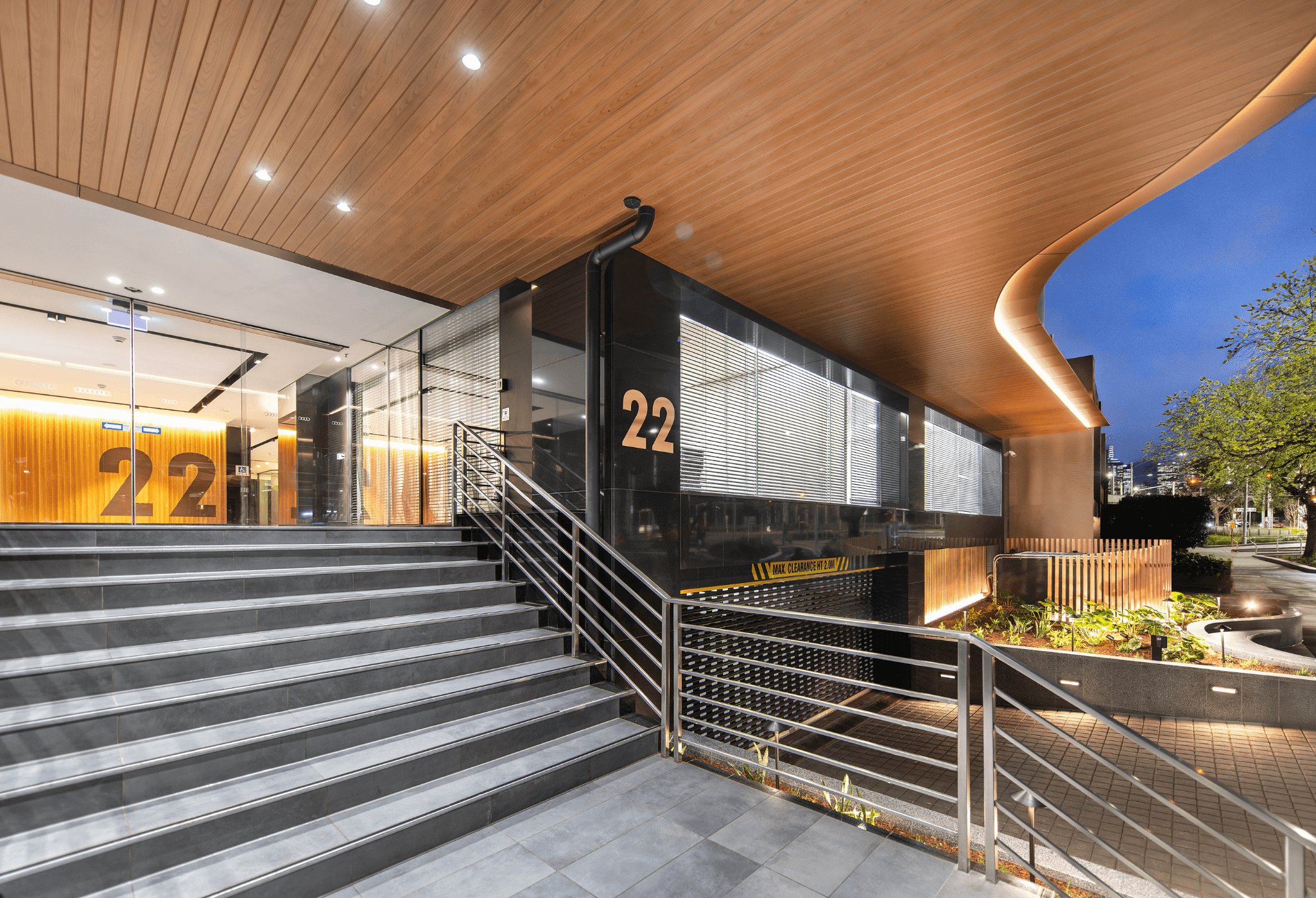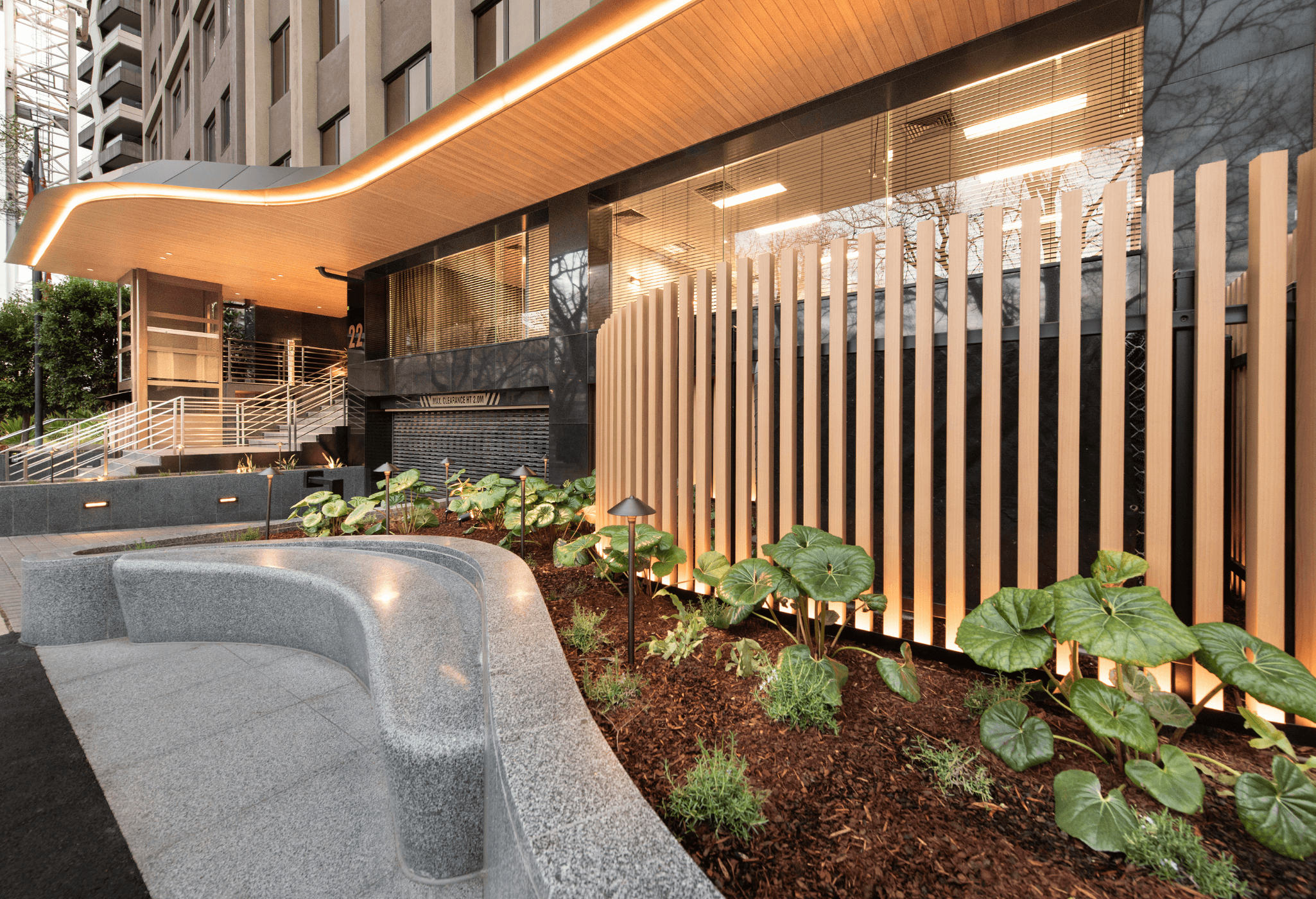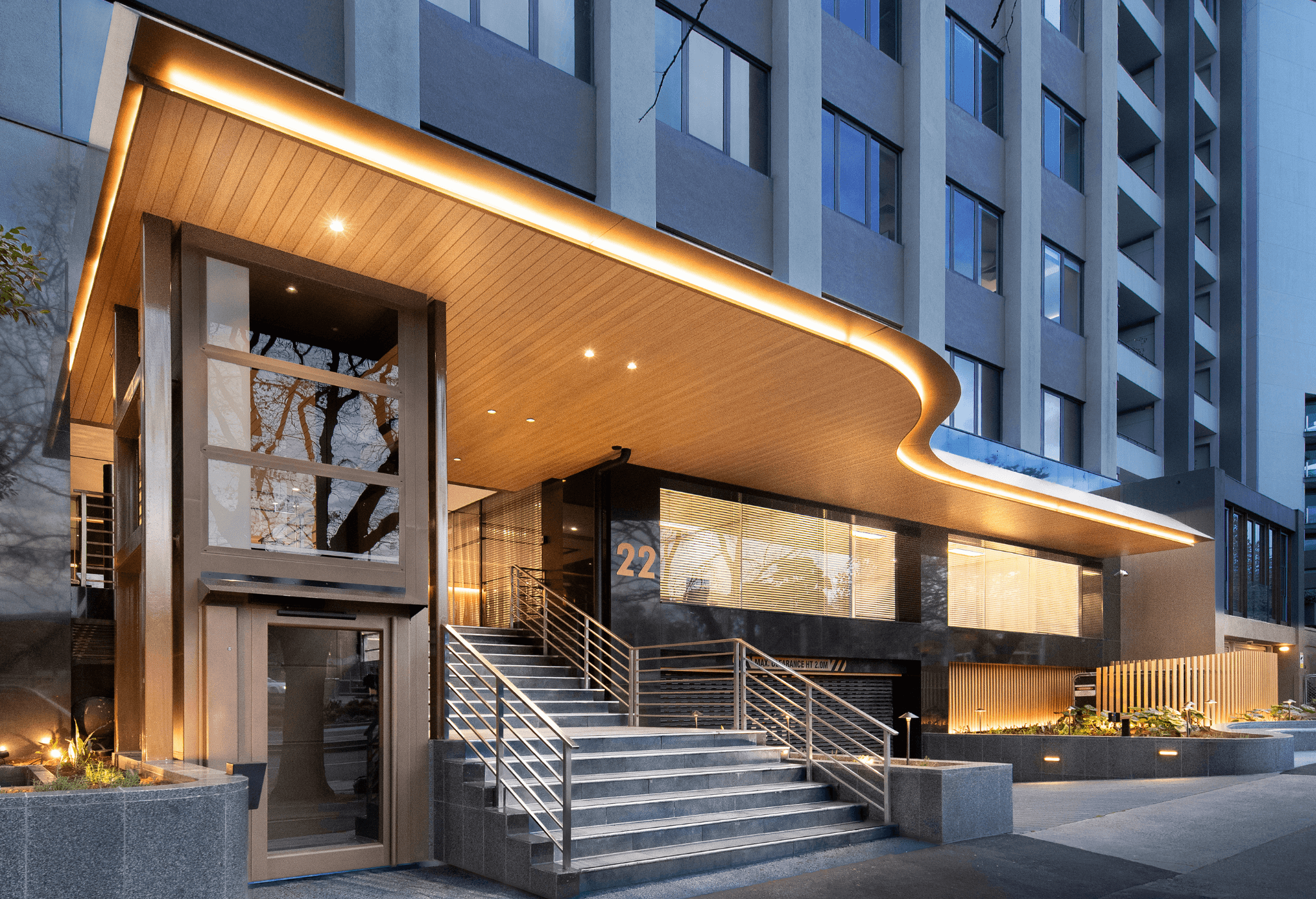 DecoBatten® and DecoClad® in DecoWood® Coastal Spotted Gum finish provided a seamless result for 22 Albert Road, creating a modern arrival experience that reflects the building’s renewed identity.