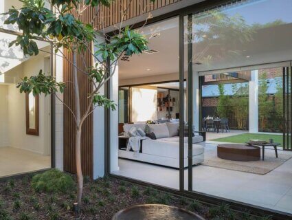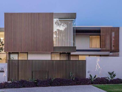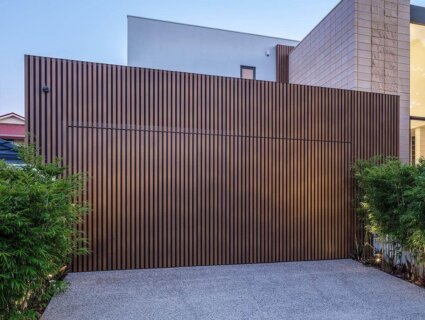 The striking garage door features 46x25mm DecoBatten, creating warmth and style that synchronizes with the nature reserve across the road. Throughout the home 46x25mm two-piece and 50x50mm one-piece battens are utilised to create a contemporary architectural facade as well as privacy screening.