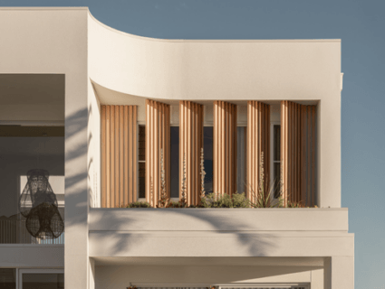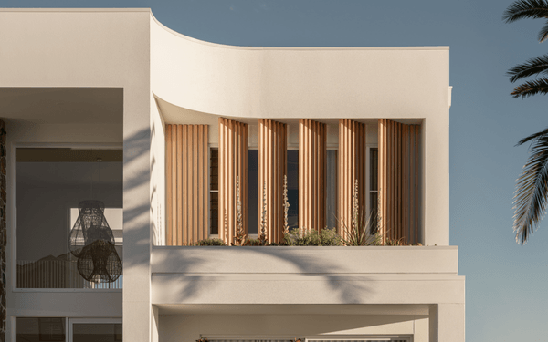 Paradise Palms features a modern coastal façade that used DecoBatten Quick Click batten system in the 50x50mm size. In the coastal classic Decowood Curly Birch finish, stone feature walls, a travertine driveway and lush tropical planting. Crisp white rendered walls and established gardens frame this gorgeous front facade for effortless indoor‑outdoor living.