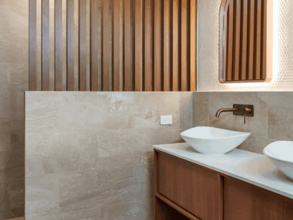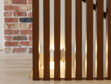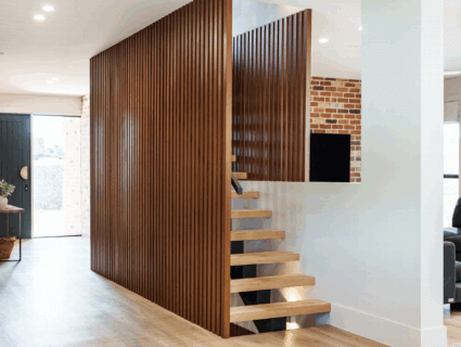 Beyond its impressive exterior, the interior design continues the theme of sophistication and resilience. Rustic red bricks introduce an earthy, grounded aesthetic, while the showstopping DecoBatten® staircase in the same DecoWood Bush Cherry becomes an instant focal point, blending craftsmanship with modern elegance.