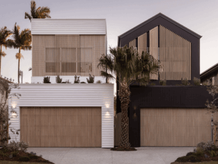 Albion Ave is a pair of bespoke modern coastal homes located in the heart of Queensland’s Gold Coast. Architecturally designed and artfully crafted with meticulous attention to detail, these luxury dwellings create a stunning visual thanks to the striking contrast of their black and white facades. Distinctly different in shape and colour, the two homes designs – that are positioned side by side – are seamlessly integrated thanks to the chosen timber-look aluminium battens and slats that are splayed across the facade and garages.