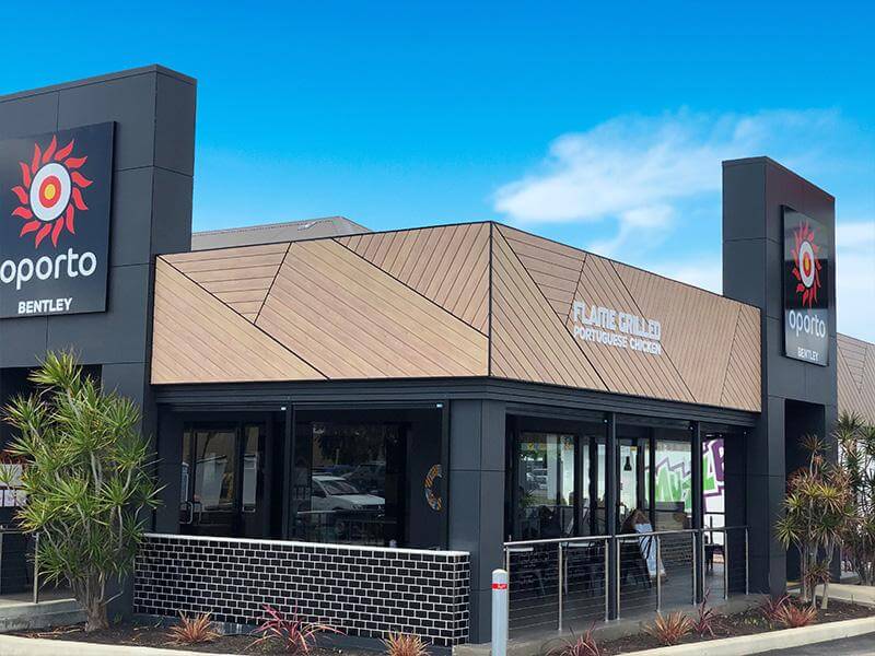 DecoClad® was applied in a unique cross-hatch pattern to portray the brand’s fresh and vibrant characteristics. The cladding was finished in DecoWood®’s Tasmanian Oak, a trendy finish that illustrates Oporto’s image as a youthful, dynamic and fun food brand.