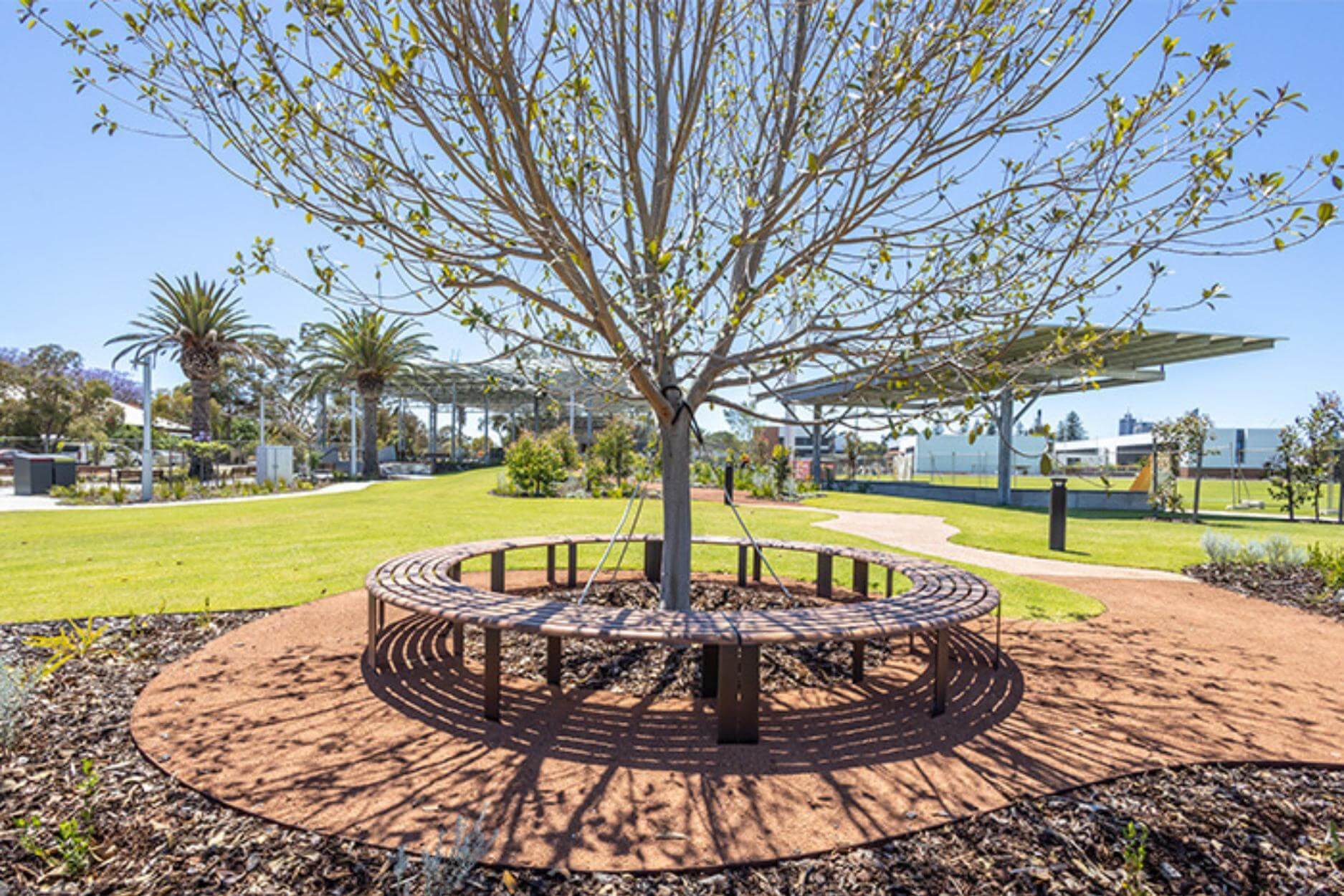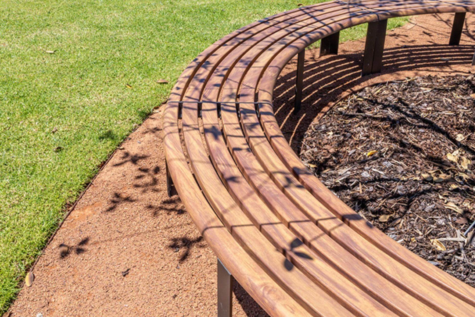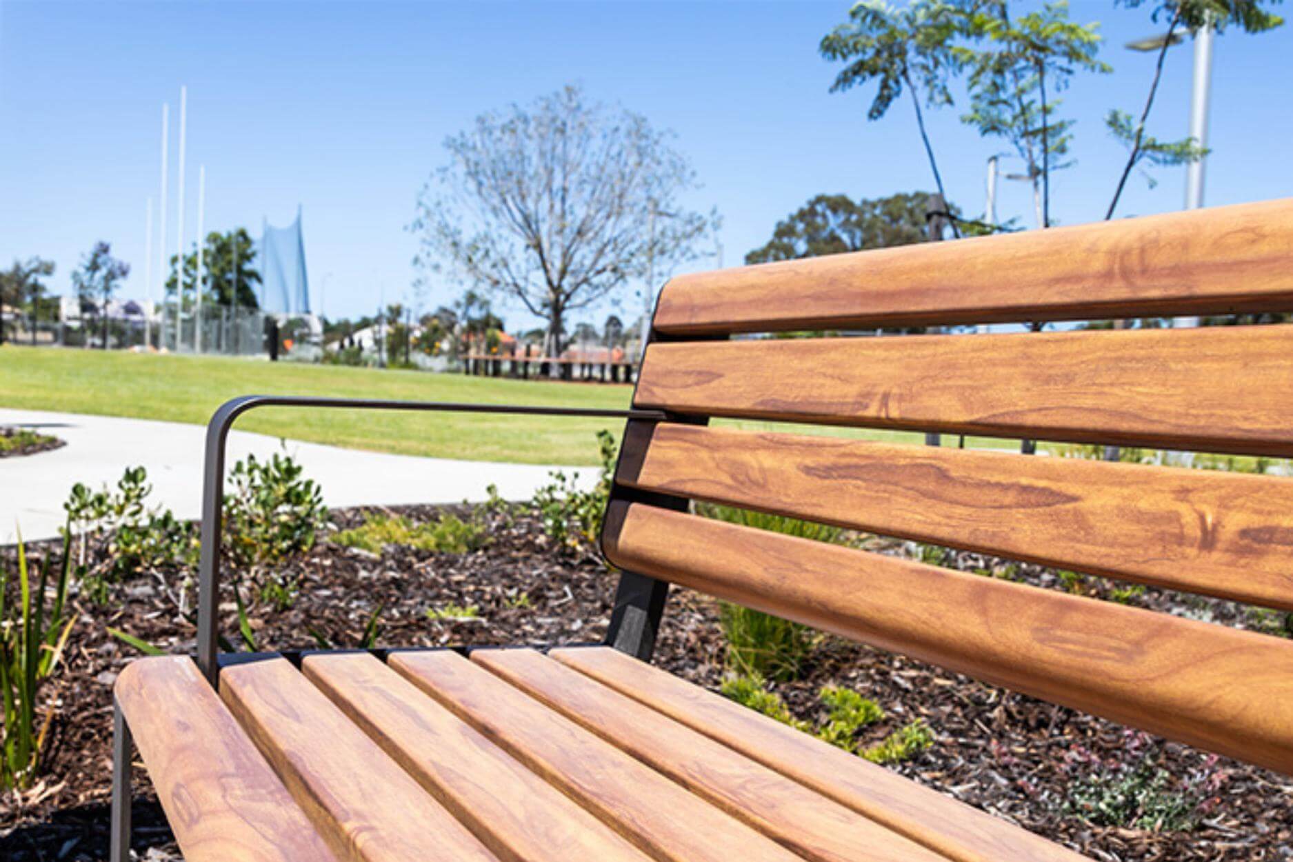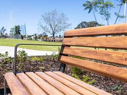 Street Furniture Australia’s ‘Linea collection’ of aluminium outdoor furniture was specified within the space to provide durable and beautiful social seating within the precinct. The combination of picnic settings, curved benches and park bench seating were all finished by DECO in a customer Super Durable DecoWood® timbergrain finish to seamlessly integrate into the surrounding environment.