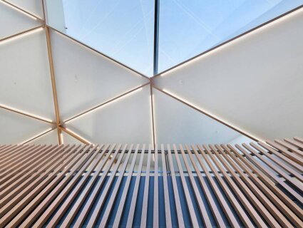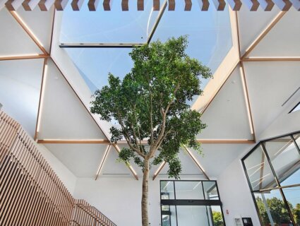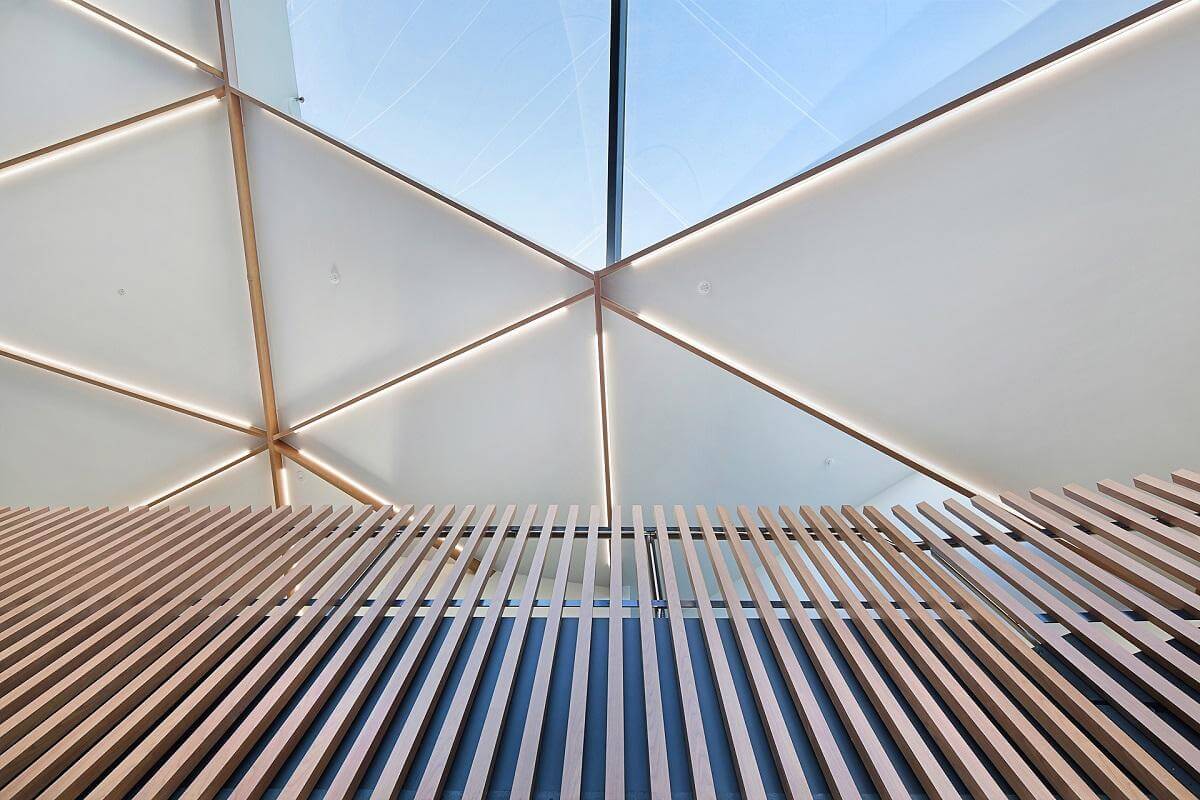 Inside the building the vibrant battens, clean white walls and soft blue furnishings achieves a stunning contrast that evokes a feeling of wellbeing and serenity.